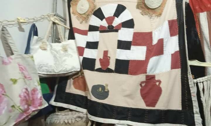 السيدة حسنه سعيد من ذوي الشهداء جاءت من مدينة جبلة لعرض منتجاتها كالأقمشة و والمنتجات المعاد تدويرها بتصاميم جميلة وبيعها، وهي تشارك في المعرض للمرة الثانية ولاقت استحسان من الزوار لمعروضاتها.